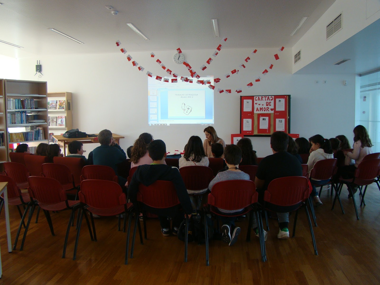 Ao longo de duas semanas (durante as quais foi assinalado o Dia dos Namorados, daí que o cenário evidencie os tons vermelhos do Amor), a Professora Bibliotecária dinamizou seis sessões de esclarecimento sobre o modelo de pesquisa Big6, envolvendo seis turmas de 6.º ano da Escola Secundária Dr. Manuel Fernandes.
